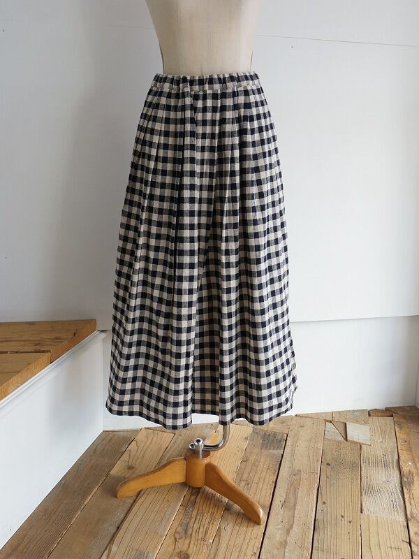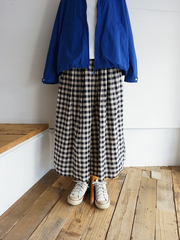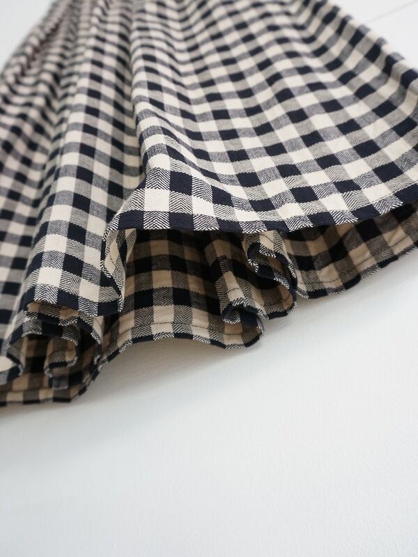 形はふわりとしたフレアのシルエット。ウエストにランダムなタックを施して、動きやすく軽やかな印象になっています。