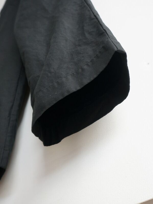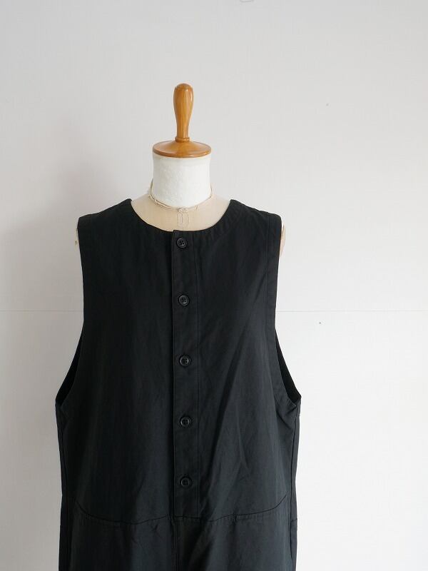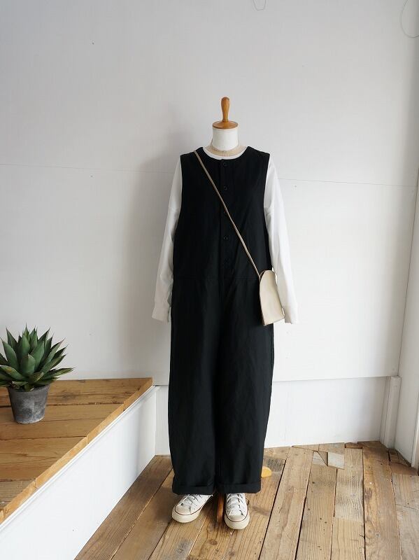 コットンとリネンの糸で織られたサテンの生地のオールインワン。フロントボタンの丸首タイプ、ボトムはストンとしたシルエットで、程よいボリューム感ですっきり着られる形になっています。軽い素材感なので重さは感じずに着心地も軽やか。ノースリーブなので合わせるインナーでいろいろな表情が楽しめます。