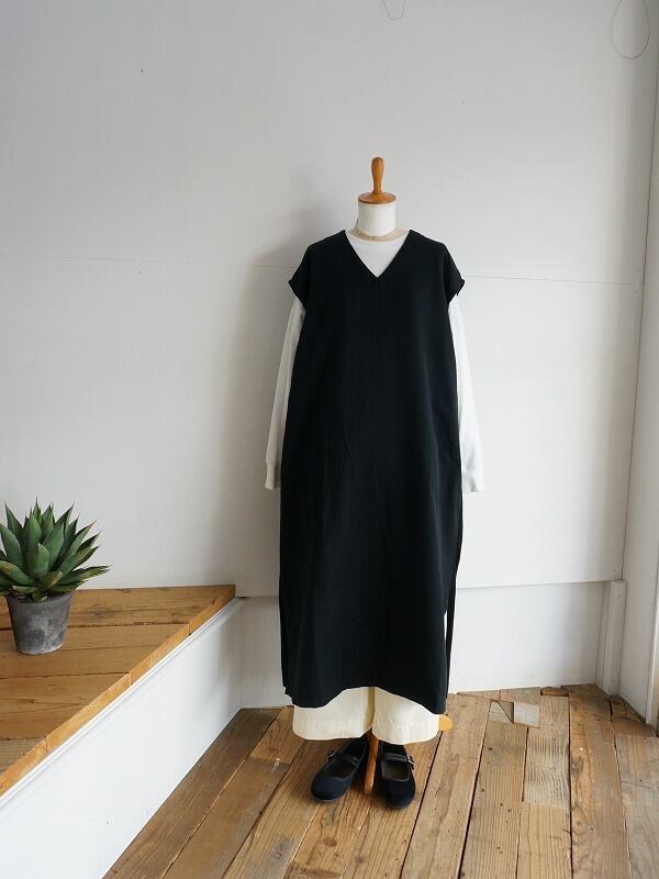 前身頃にしなやかなコットンツイル、後ろ身頃に度詰めで強度のあるコットン天竺の生地を使っています。すぽっと着られる、重ね着対応のワンピースです。