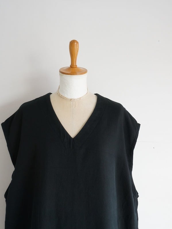 すっきりVネックに、袖はフレンチスリーブ。裾には両サイドにスリットが入ります。インナーを使い分ければ季節をあまり問わずに、長く着回しに使っていただけます。