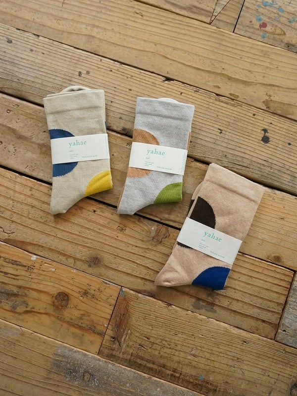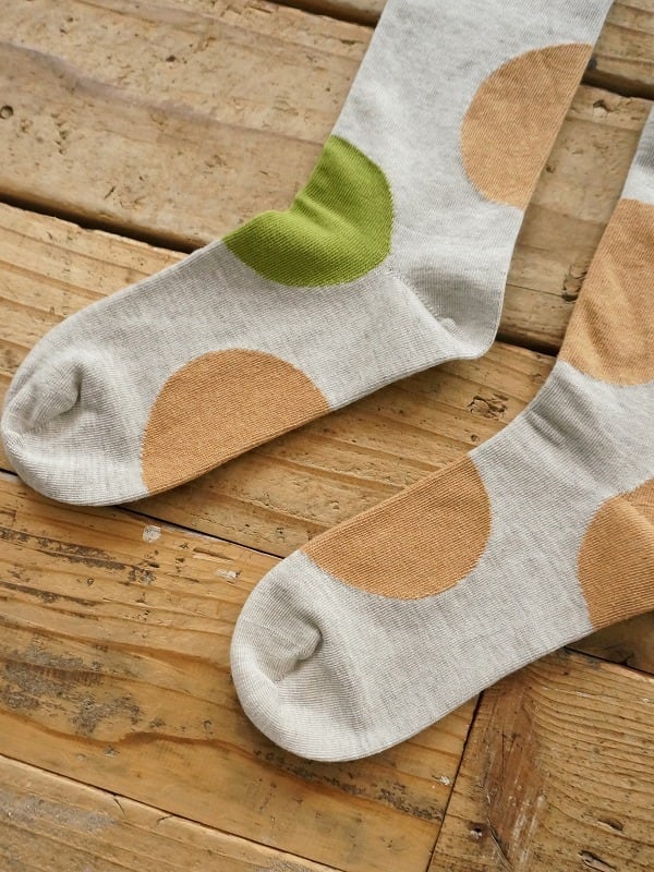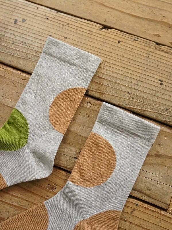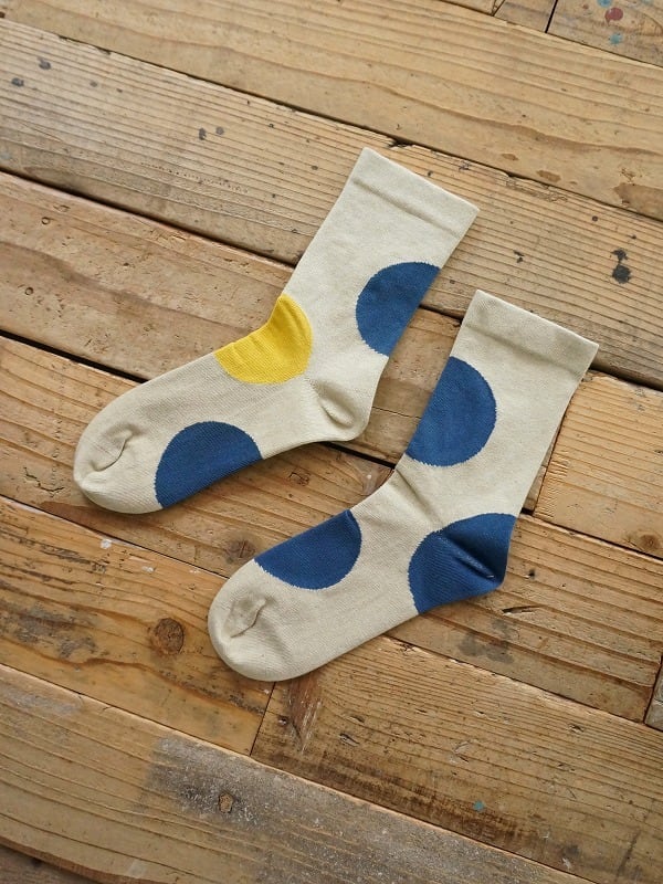オーガニックコットンで編みたてた大きなドットが印象的なソックス。履き口はゴムなしです。左右それぞれドットの位置を変えたアシンメトリー柄になっています。