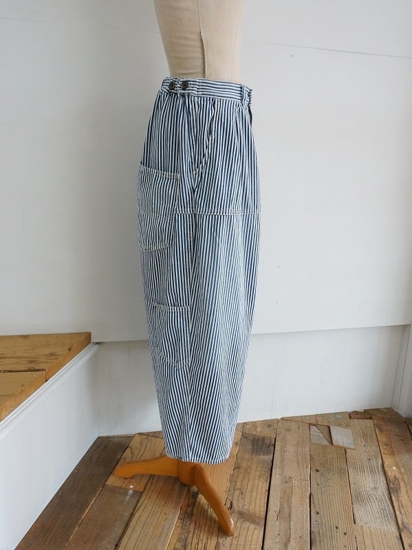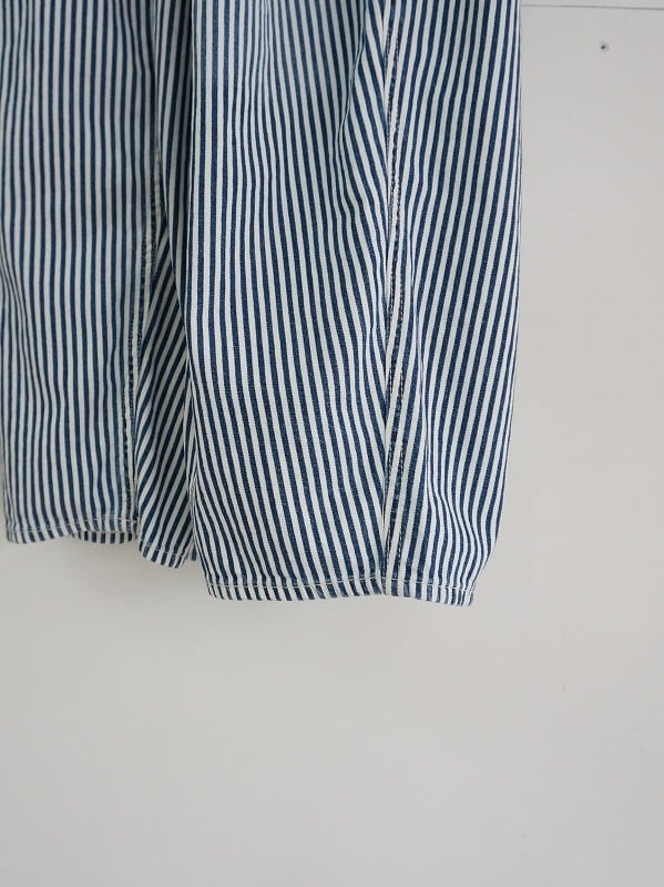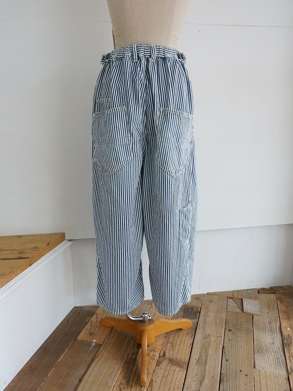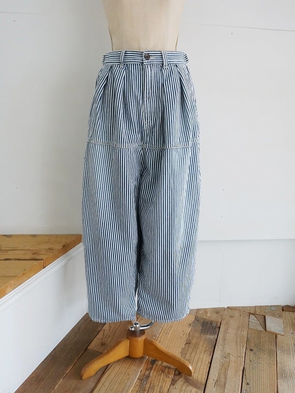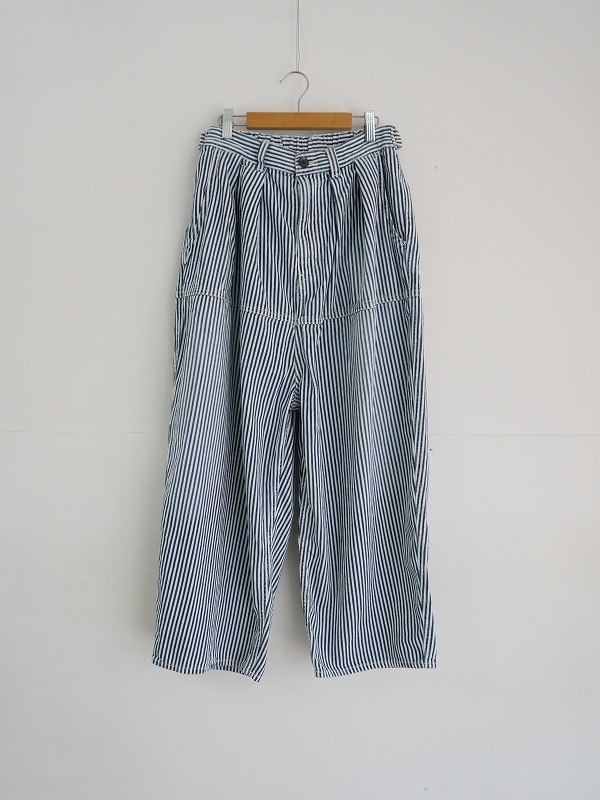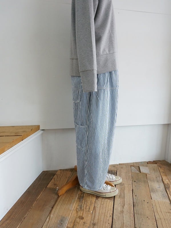 2タック入りでぷくっとまるみのあるシルエット。こちらはヒッコリーストライプにユーズド加工を施してやわらかくなじんだ質感に仕上げています。裾の仕様はノーマルタイプ。ウエストは後ろ側がゴム仕様でアジャスター付き。深めの股上で抜け感があり、ラクチンに穿ける1本に仕上がっています。