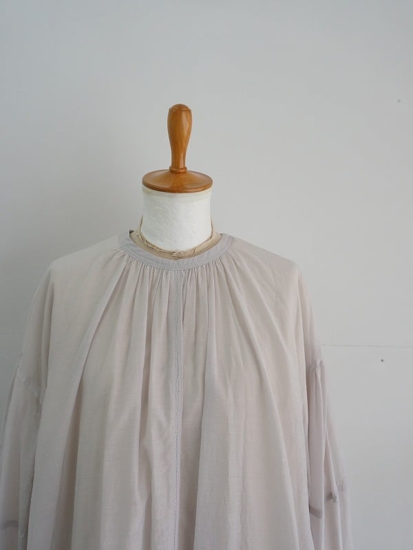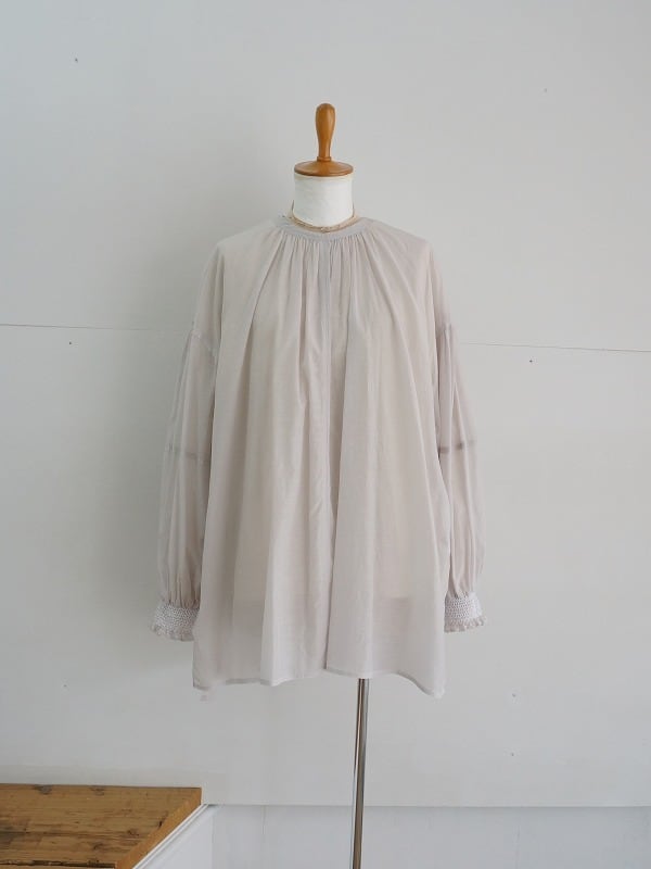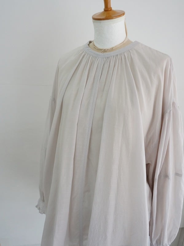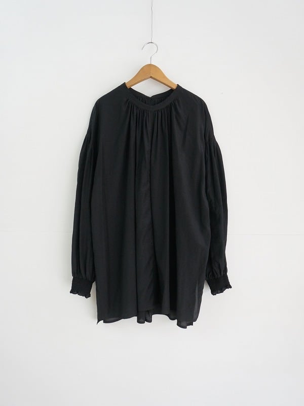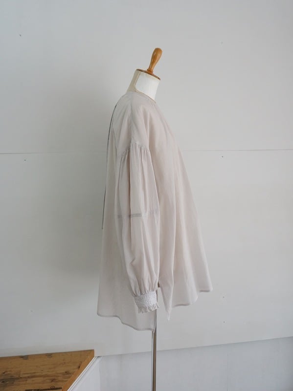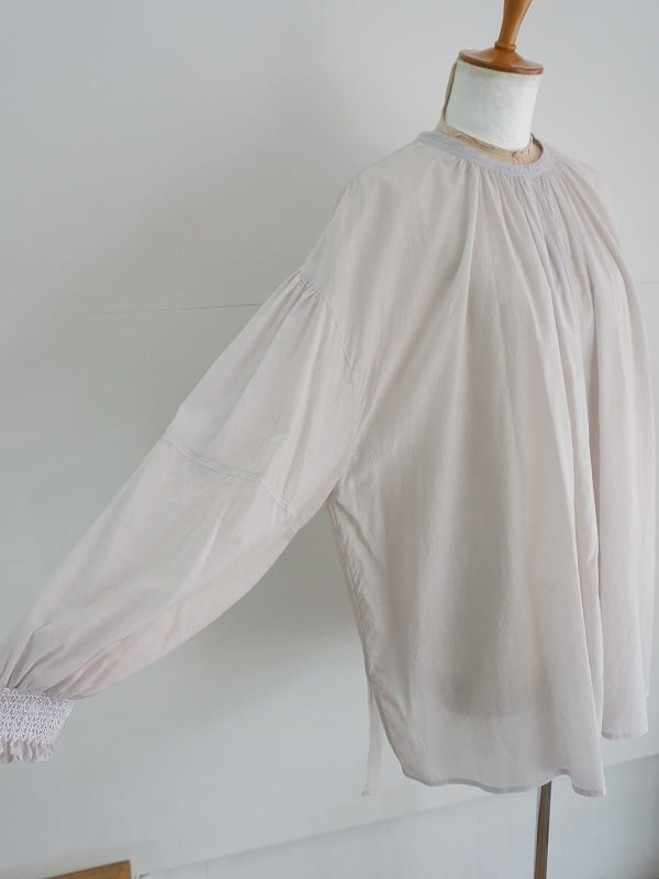 デザインは着丈やや長めのプルオーバータイプ。ゆるやかなAラインのシルエットで、袖口にシャーリングを寄せて袖にふくらみを持たせています。腕でゴムが留まるので、袖をたくし上げてボリューム感を調節してみてください。