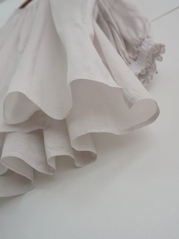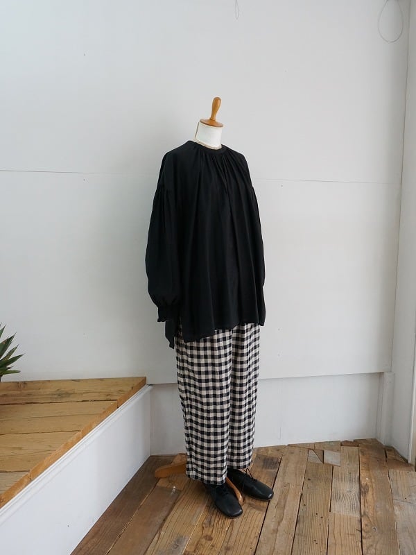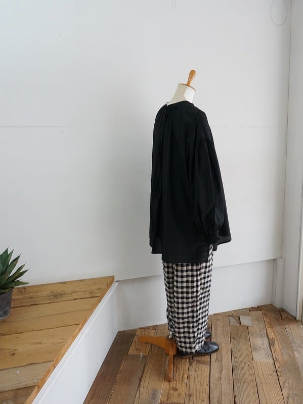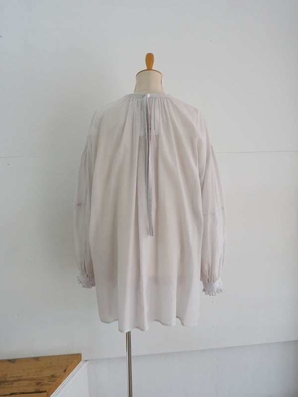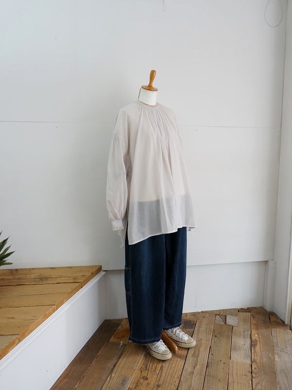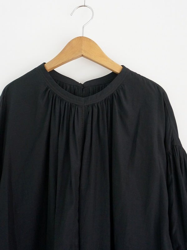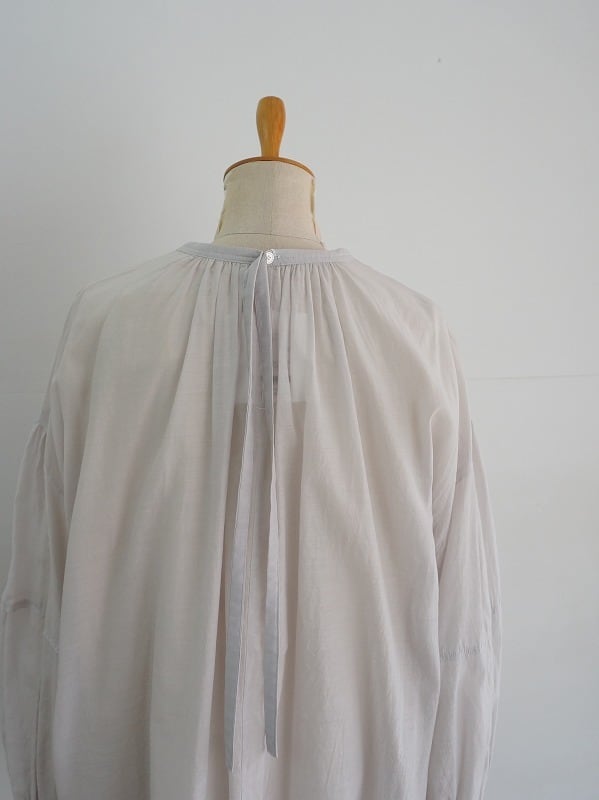 デザインは着丈やや長めのプルオーバータイプ。ゆるやかなAラインのシルエットで、袖口にシャーリングを寄せて袖にふくらみを持たせています。腕でゴムが留まるので、袖をたくし上げてボリューム感を調節してみてください。