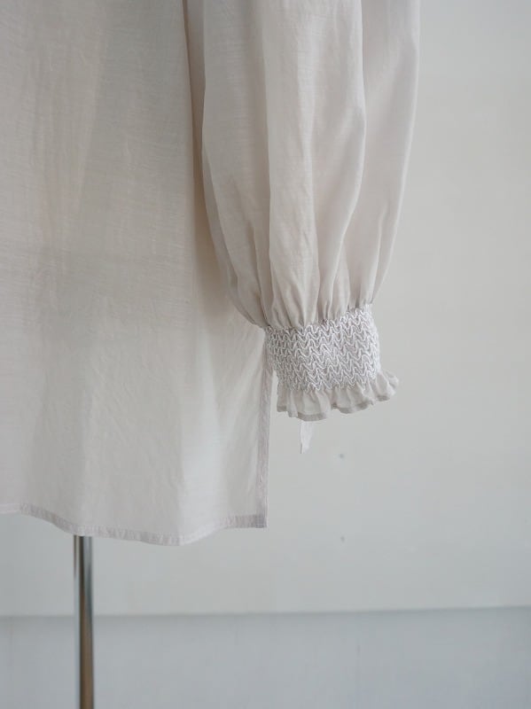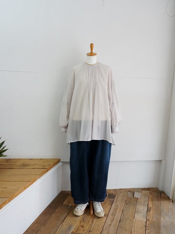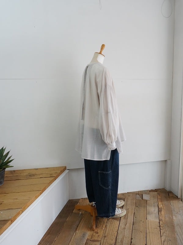 細番手のコットン糸にキュプラを織り合わせた繊細で軽やかな生地を使っています。微光沢とほのかな透け感がある、涼やかな雰囲気のブラウスです。