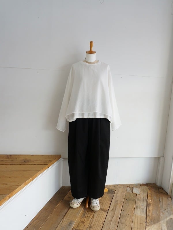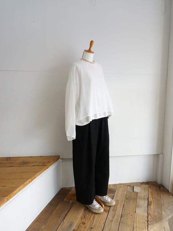 薄手で肌触りの良い天竺地が内側、とても軽い布帛の生地には、ほのかに透け感があり、微光沢が備わっています。洗い加工仕上げ。カットソーにやや斜行がみられますが製品の風合いとしてご理解ください。