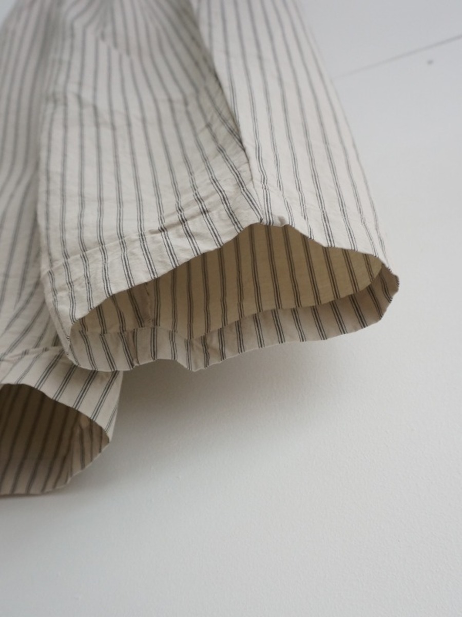 薄手ながら張りがあり、ドライなタッチの生地です。ライトグレーがベースでストライプ柄が入っています。