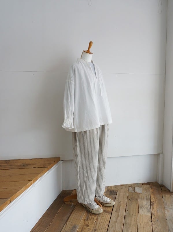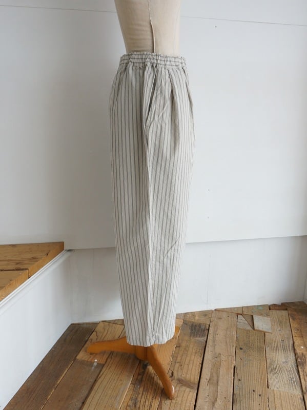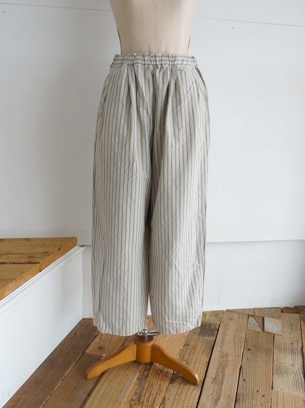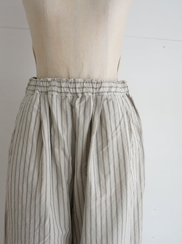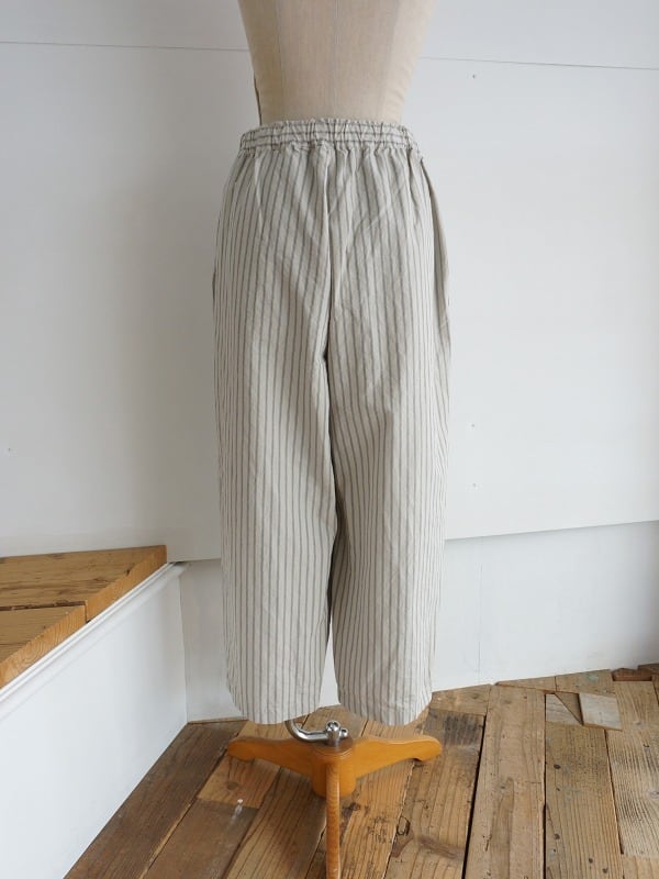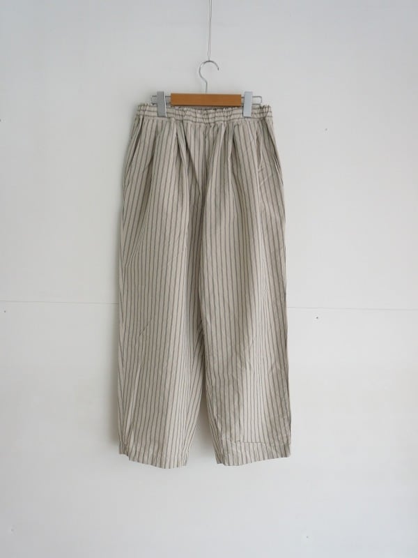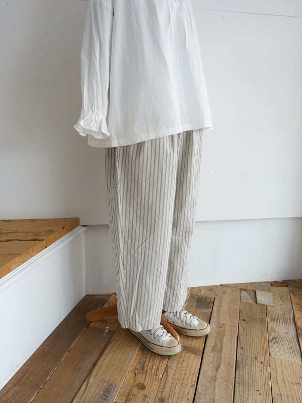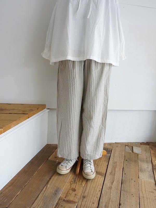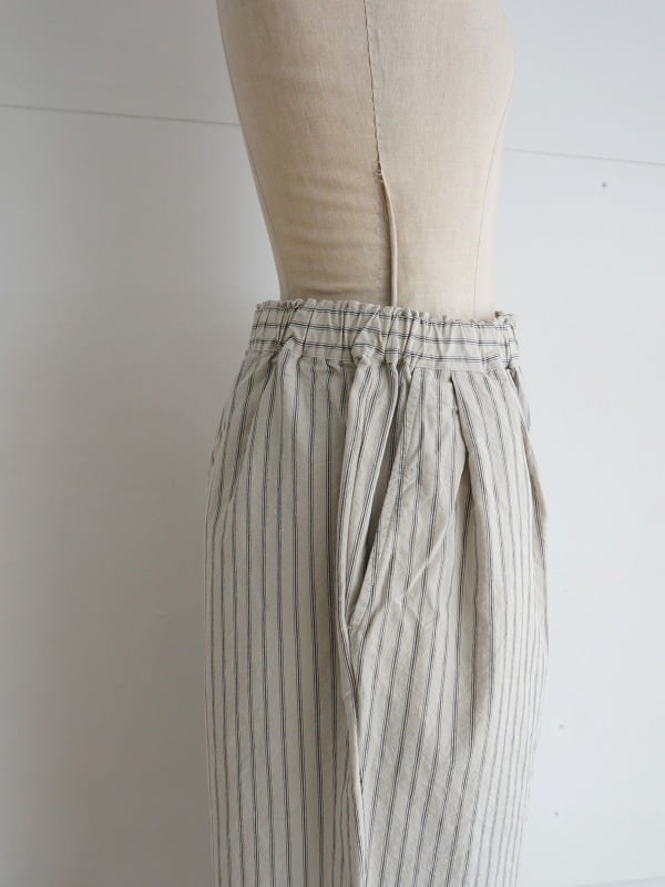 程よいゆとりのワイドシルエット。ストライプがシンプルなコーディネートにアクセントになってくれます。張り感が心地よく、夏場まで活躍する1本。Tシャツとのコーディネートも楽しみです。