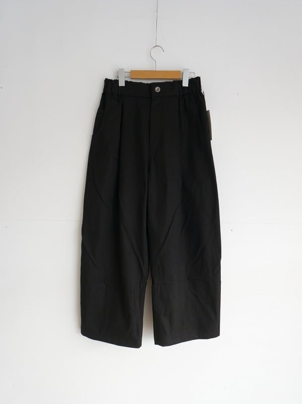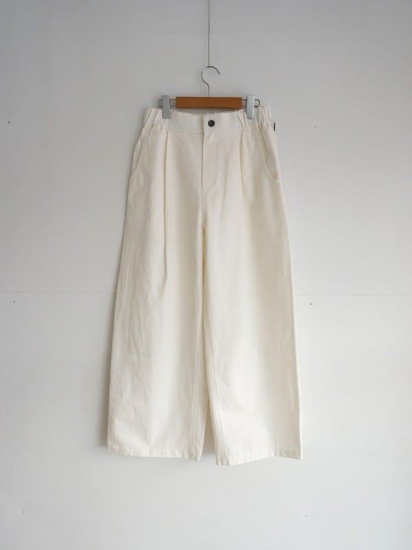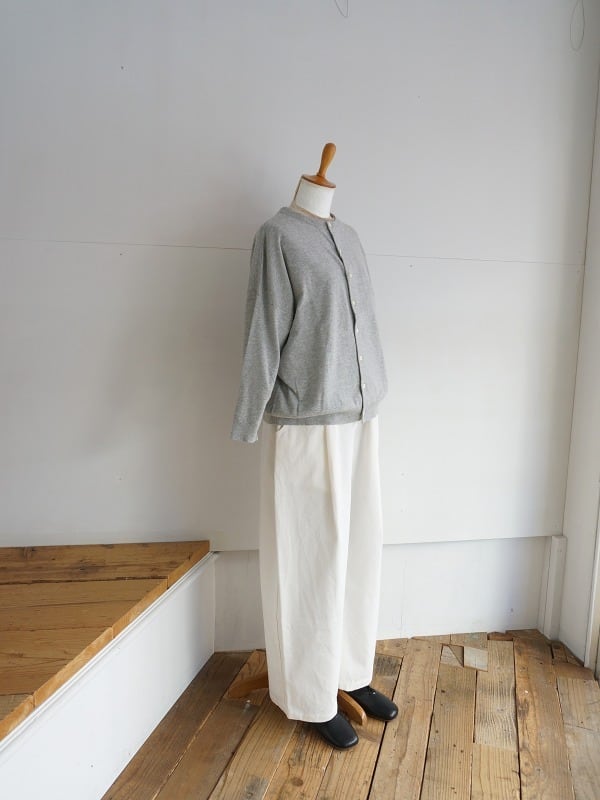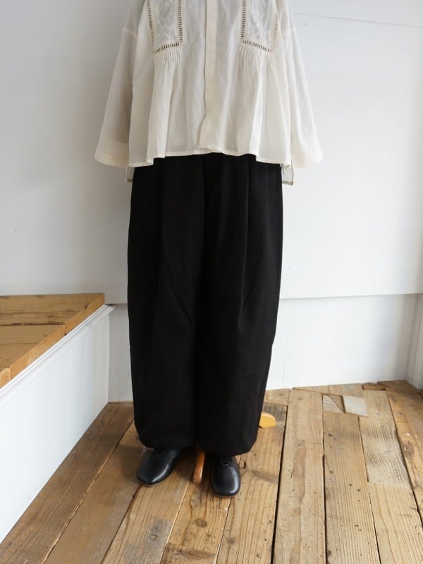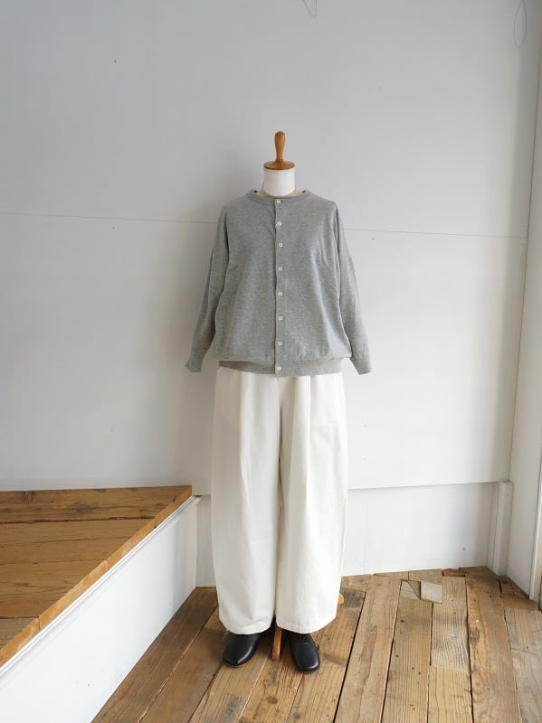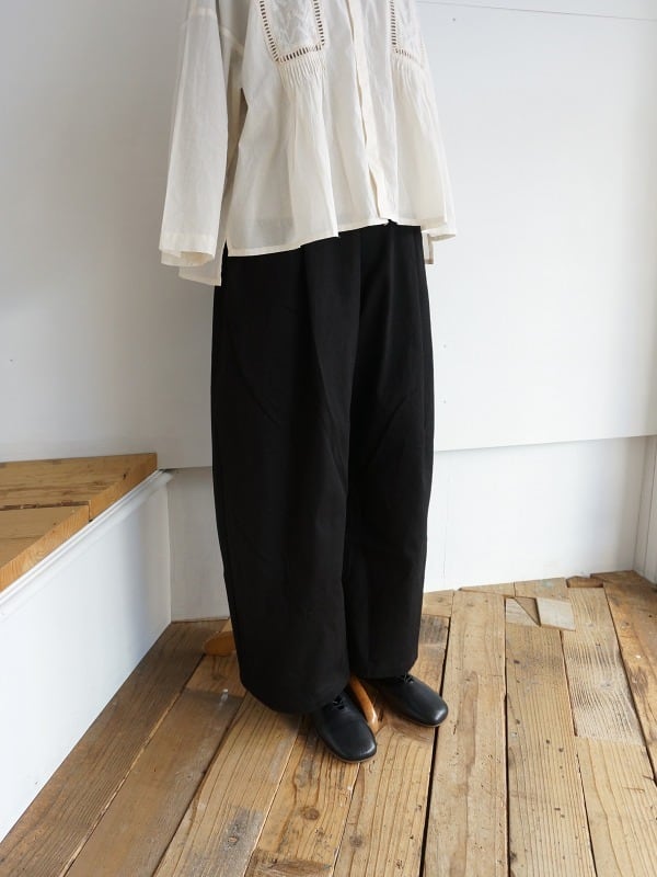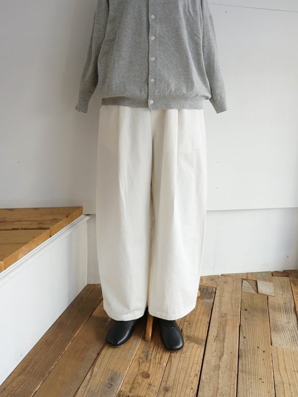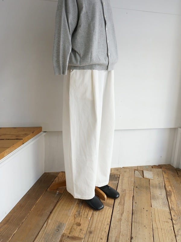 ワンタック入りで、ワタリにかけて絶妙にカーブをつけたシルエット。体型をカバーしつつ、バランスよくコーディネートをまとめてくれる形になっています。