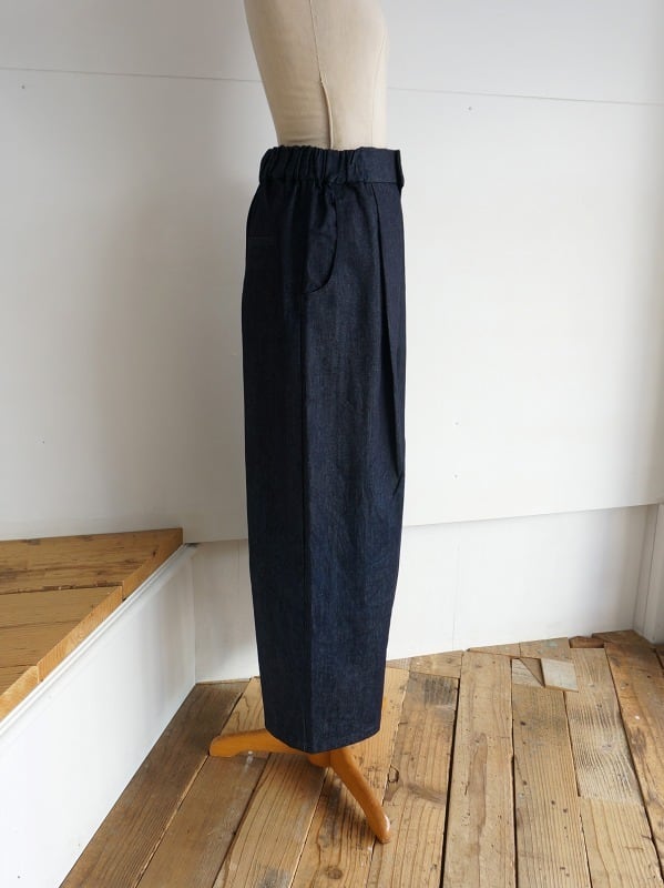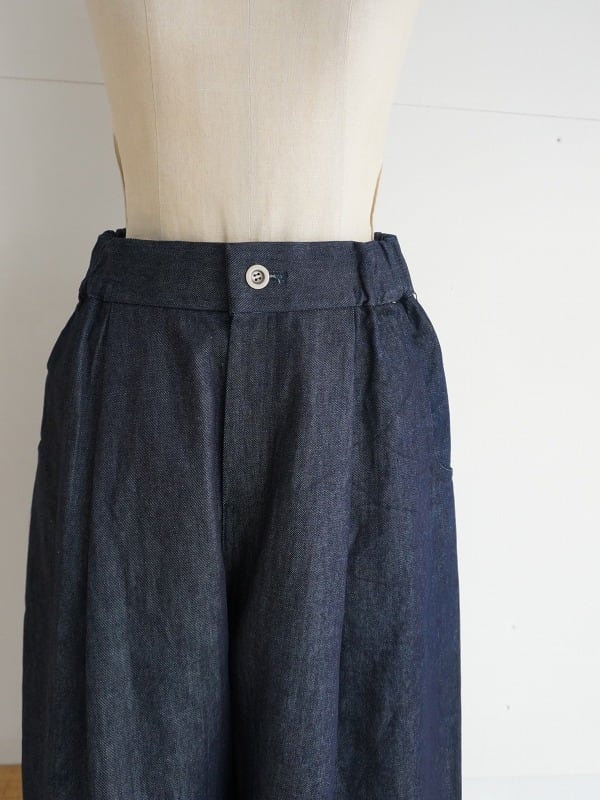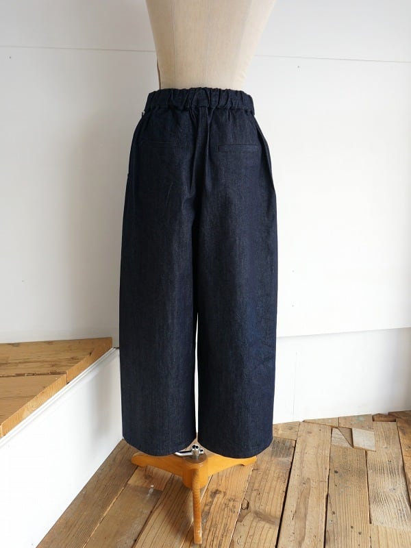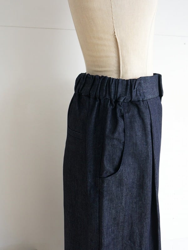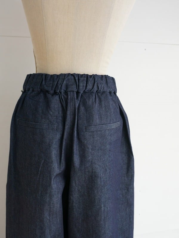 ウエストはサイドから後ろにかけてゴム仕様。ボタンが付いていますが開き見せです。生地感はデニムでありながら比較的目面がきれい。品よく着られるデニムパンツに仕上がっています。