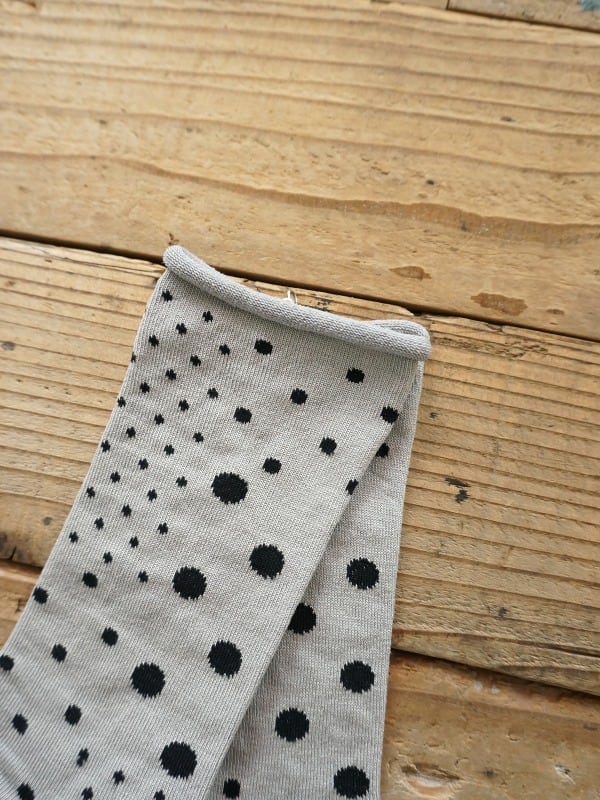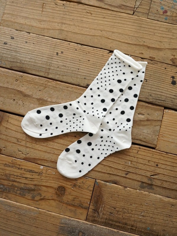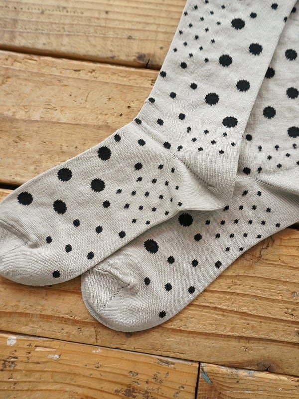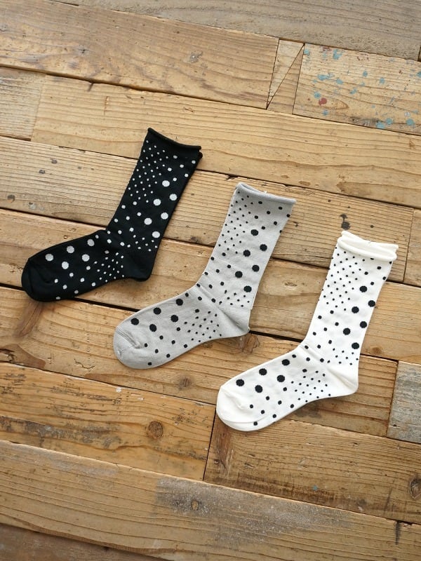■パッチワークドットソックス 大中小のドットをパッチワーク状に組み合わせたソックスです。 モノトーンの色合いで構成されたさりげない存在感の1足。足元をユニークに引き立ててくれます。 〈素材〉 綿72%・ポリエステル18%・ナイロン8%・ポリウレタン2% 〈カラー〉 オフ、グレー、クロ 〈サイズ〉 ワンサイズ:約23cm~25cm 履き口からかかとまで約21㎝