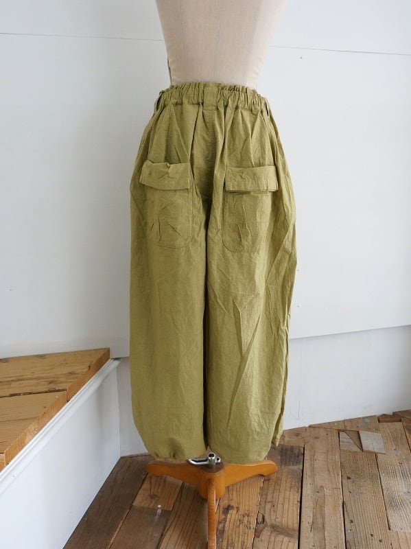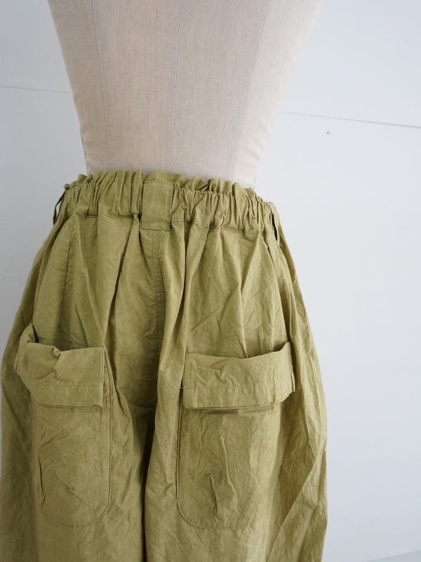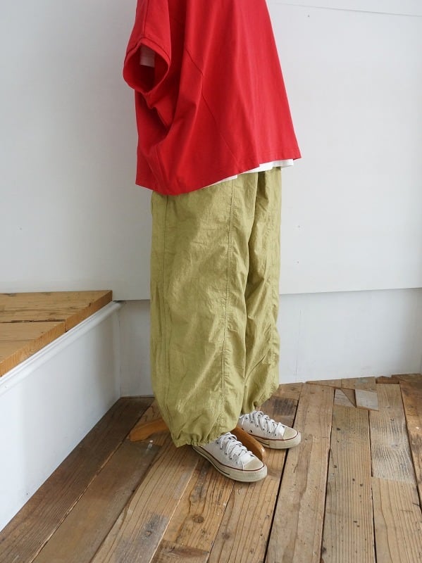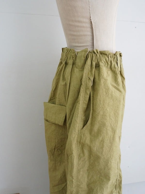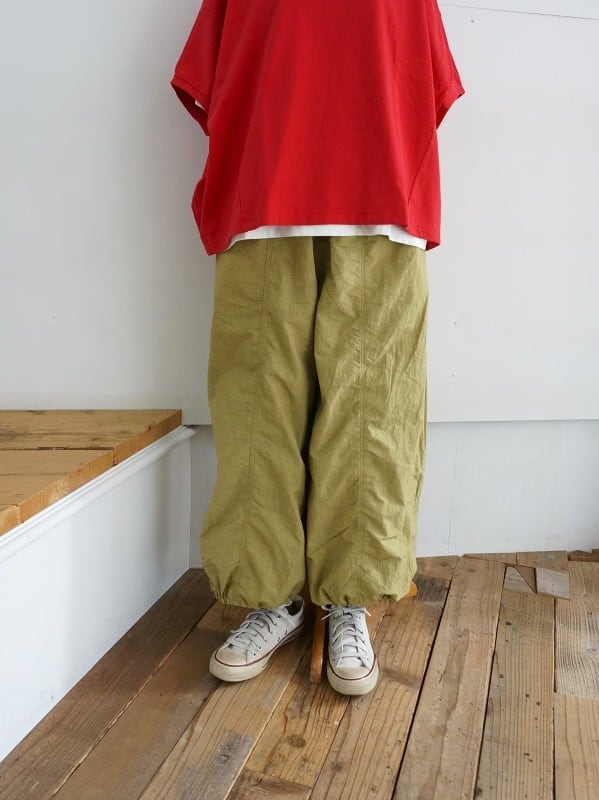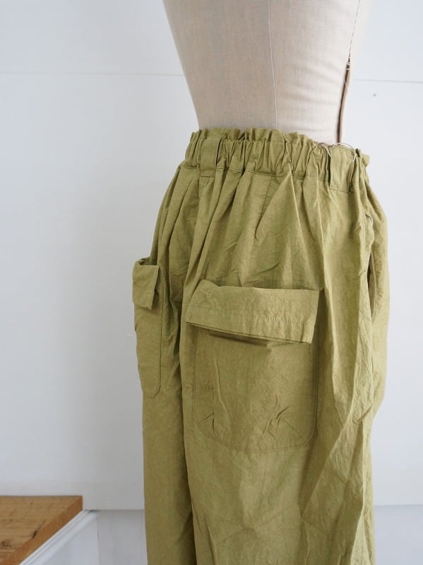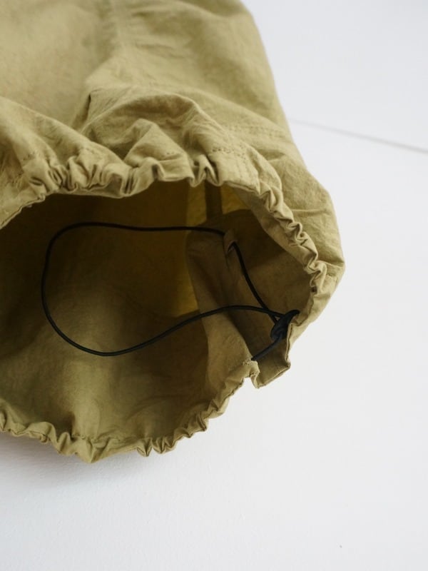 形はワイドでストンとしたリラックスシルエット。裾にはバンジーコードが仕込まれ、絞ればシルエットに変化がつけられます。袋状になった後ろのフラップポケットもポイントになっています。