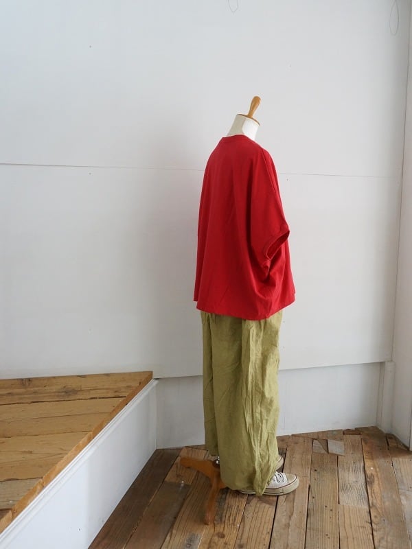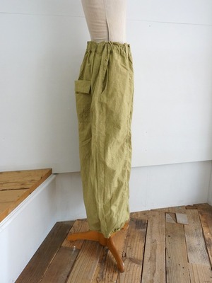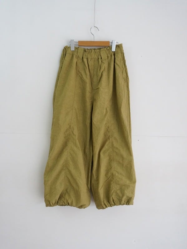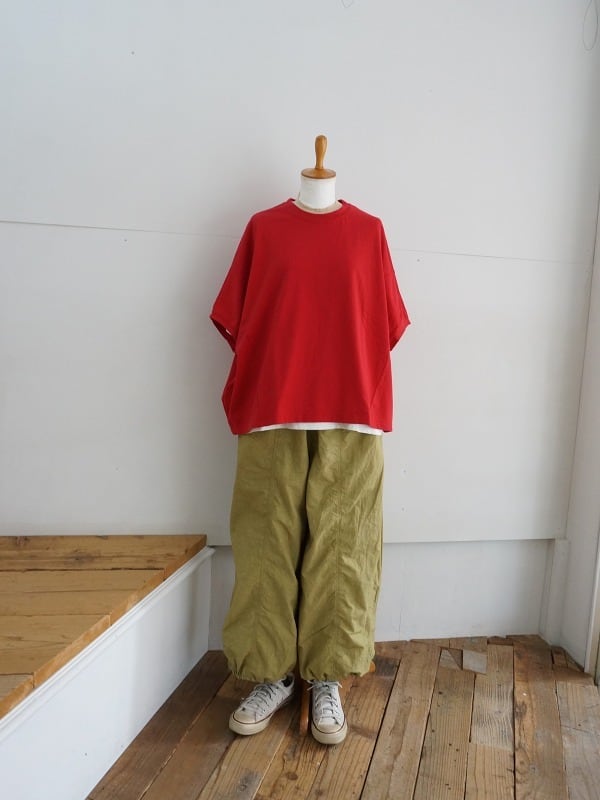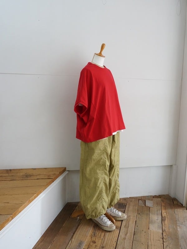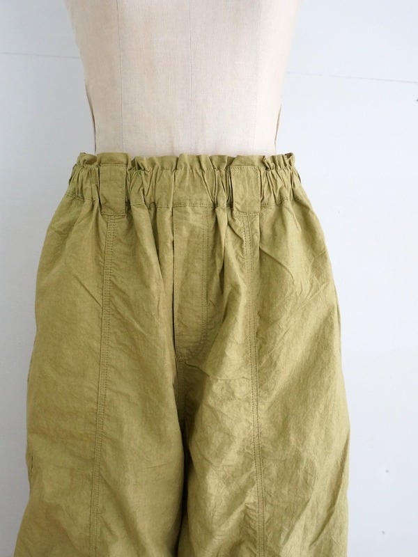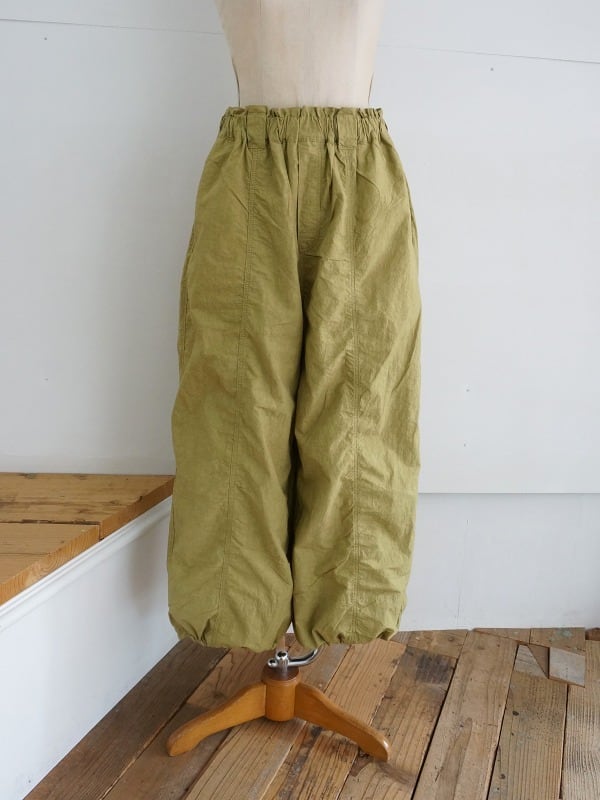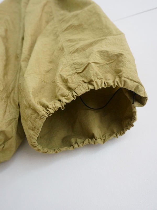 形はワイドでストンとしたリラックスシルエット。裾にはバンジーコードが仕込まれ、絞ればシルエットに変化がつけられます。袋状になった後ろのフラップポケットもポイントになっています。