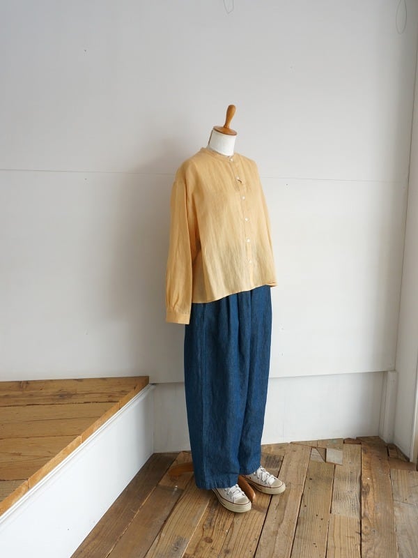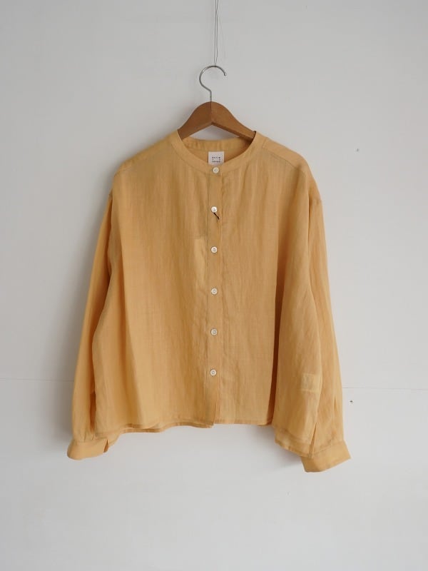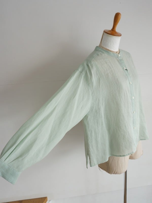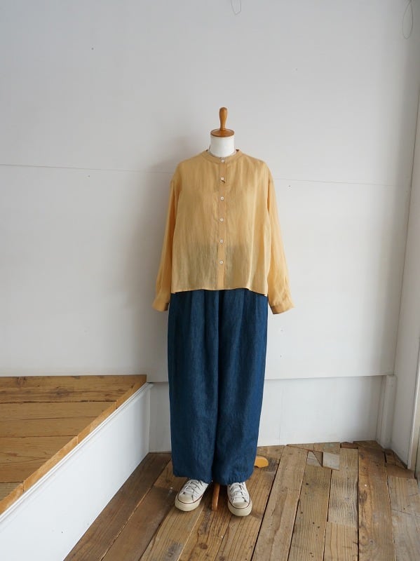 天然素材のラミーリネンを使った、しゃりっとした肌触りが特徴の生地を使っています。ドロップショルダーのゆったりしたシルエットで風の抜けが感じられるシャツです。形はシンプル、丈はやや短めになっています。