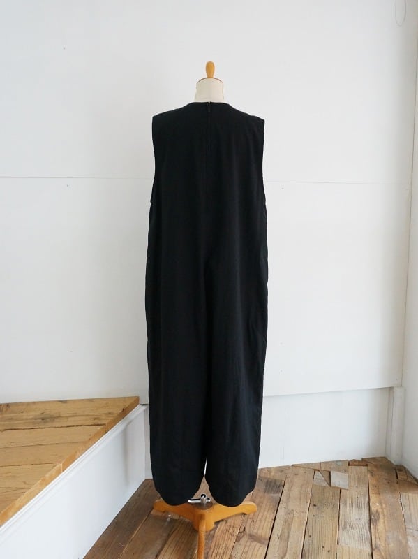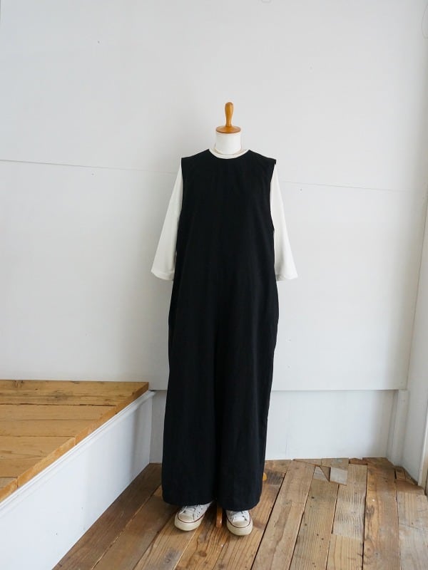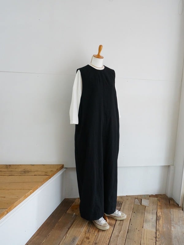綿麻の天然素材で高密度に織り上げられた生地使っています。細部にまでバランスを見て「ちょうどいい」シルエットを目指したオールインワンです。