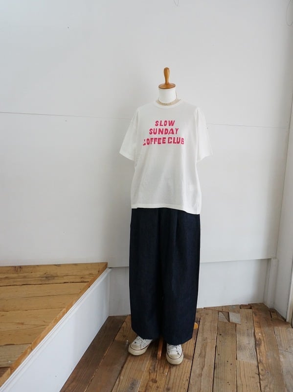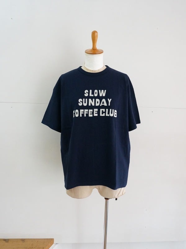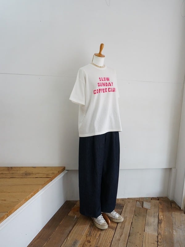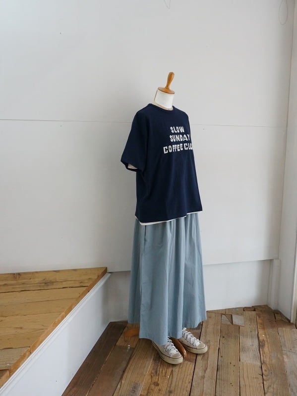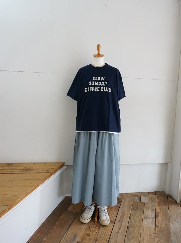 程よくゆとりがありシンプルに着られる形。肌なじみもよく、リラックスして着られます。プリントは日曜日の午後のスローなコーヒークラブをイメージしたもの。フロッキーのプリントもいい雰囲気です。