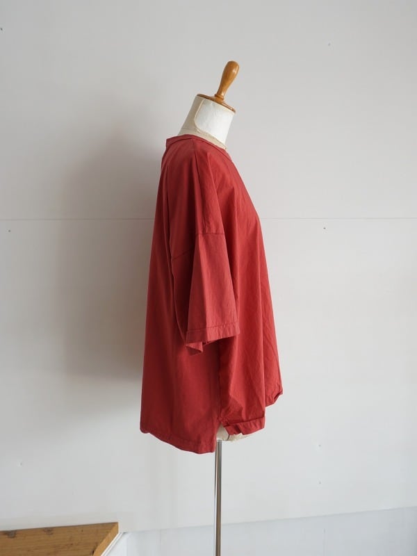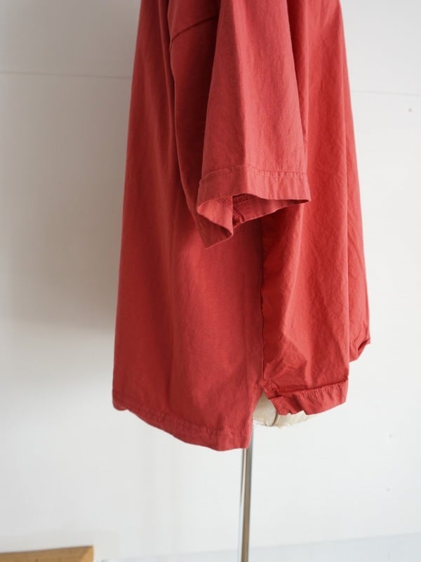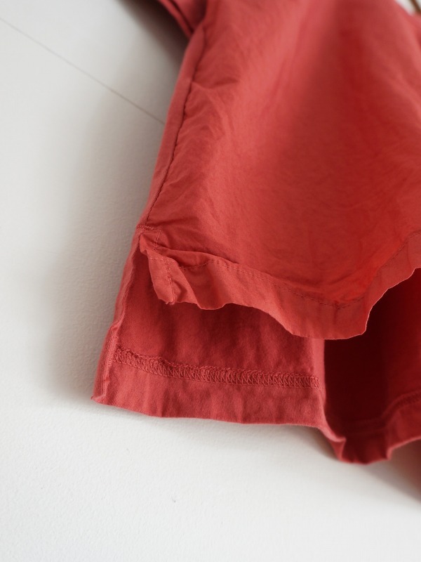 前身頃にさらっとしたタイプライターの生地、袖と背中はやわらかな天竺地です。製品染めで色付けされた風合いのある仕上がりです。