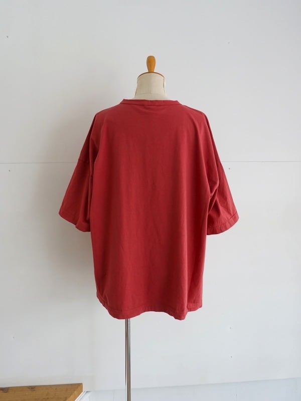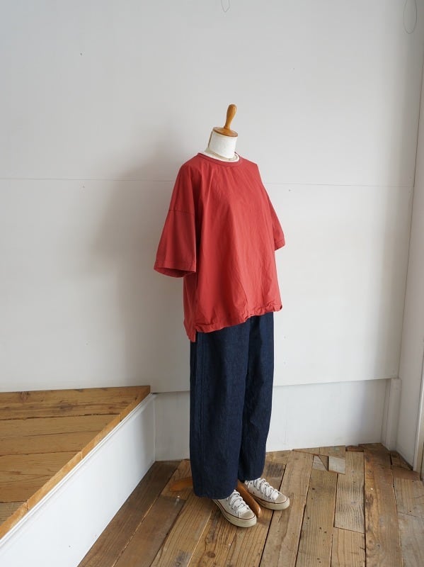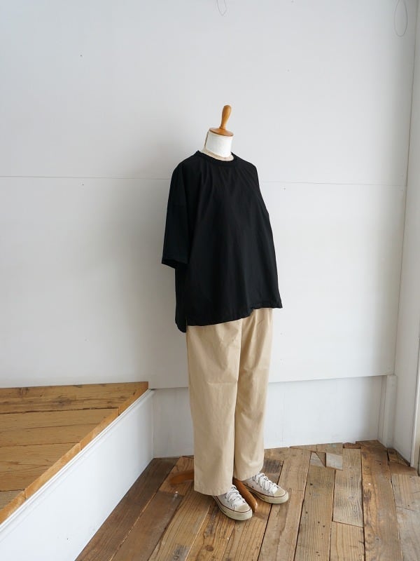 前身頃に布帛の生地、袖と背中にカットソーを使ったクルーネックの5分袖Tシャツです。ゆとりのあるボックスシルエット、裾には前後差がありスリットが入っています。軽くてさらっとした着心地。シンプルだけど、ひとひねり効いたデザインが着こなしのポイントになってくれます。