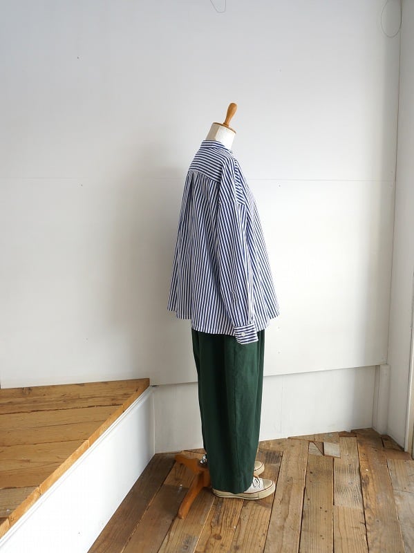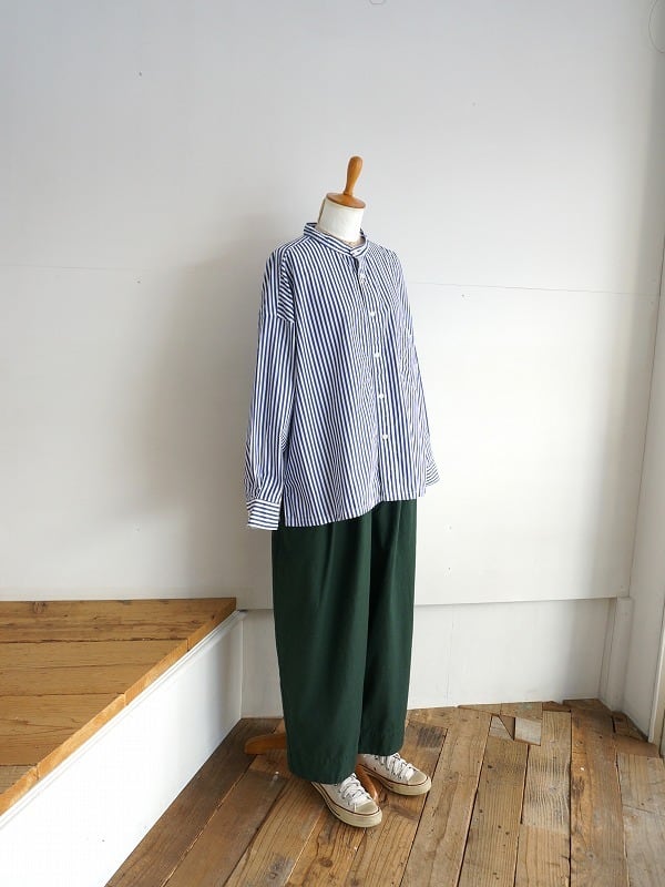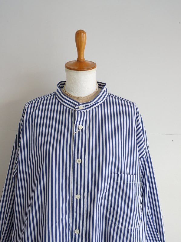 低めのスタンドカラーに、すっぽり体が収まるボックスシルエット。裾にはスリットが入ります。バランスのとりやすい丈感なのでいろいろなボトムと合わせてどうぞ。ストライプをアクセントにロングシーズン活用していただけます。
