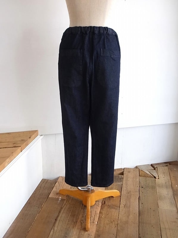 トラバイユマニュアルの定番アイテムのひとつ、デニム素材のペグパンツです。