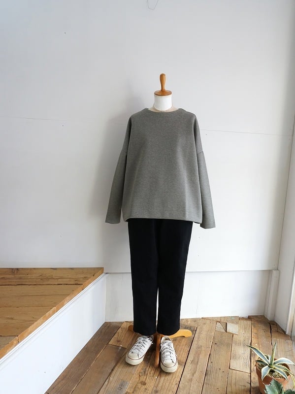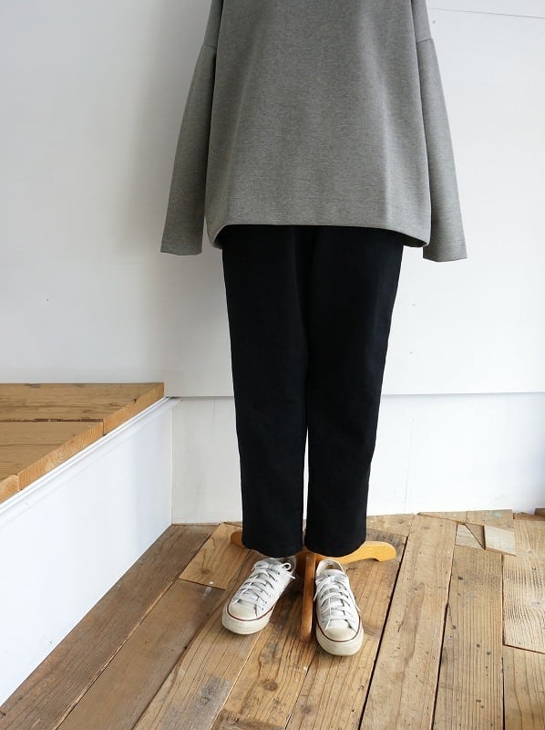 股上深めで腰周りにゆとりがあり、膝から裾へ細くなるシルエット。細身に見えて適度な抜け感があるので、ピタピタになりすぎずにすっきり穿ける形です。