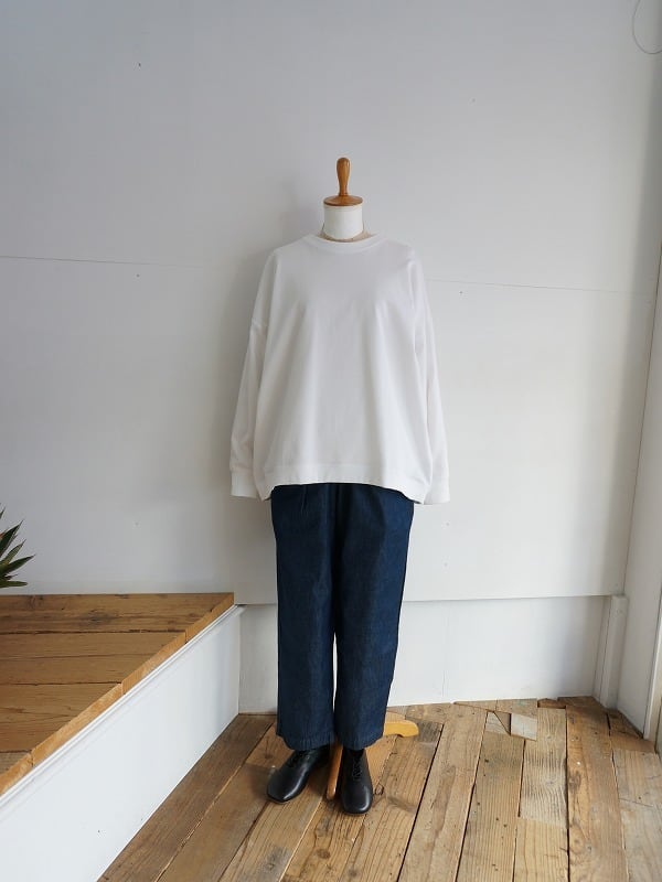 テーパードシルエットのイージーパンツ。タックをひとつとり、腰周りに適度なゆとりを持たせた形です。レングスは9分丈くらいで、程よい抜け感があってリラックスして穿いていただけます。年間通して長く使える生地感とオーソドックスな形は何かと着回しに便利です。