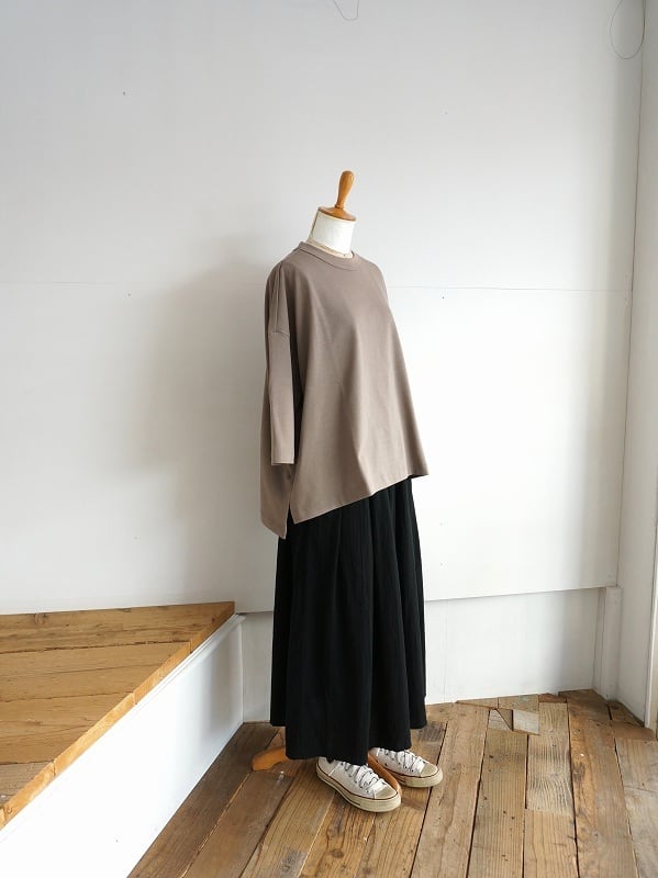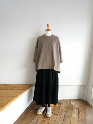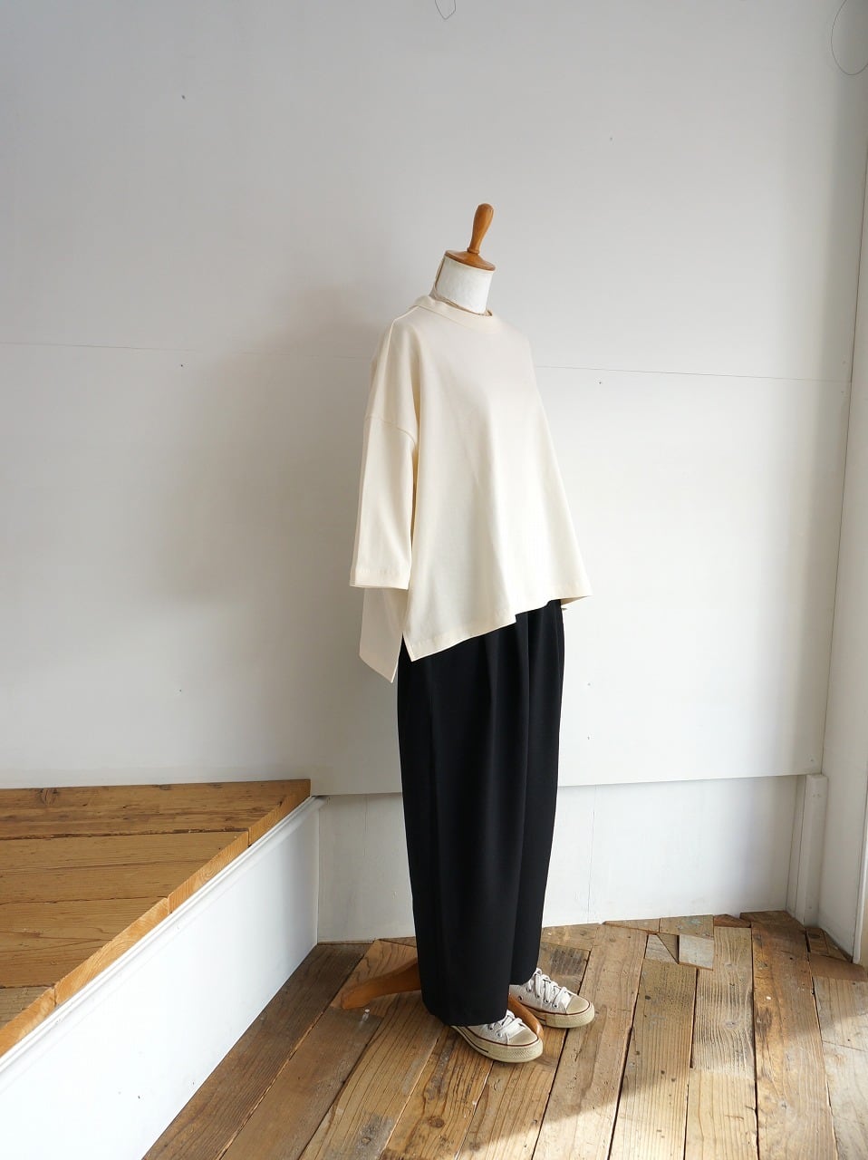 身幅を広くとり、サイドが下がって立体感のあるシルエットに。裾には前後差があり、動きのあるスタイリングが楽しめます。