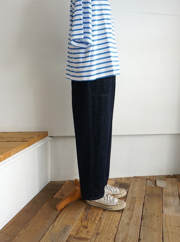 甘撚りのやわらかめのデニムを使ったこちら。適度にゆとりのあるシルエットで裾へテーパードした、少しまるみのある形の1本です。