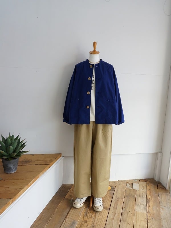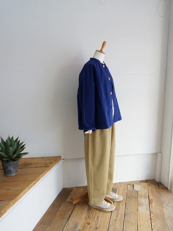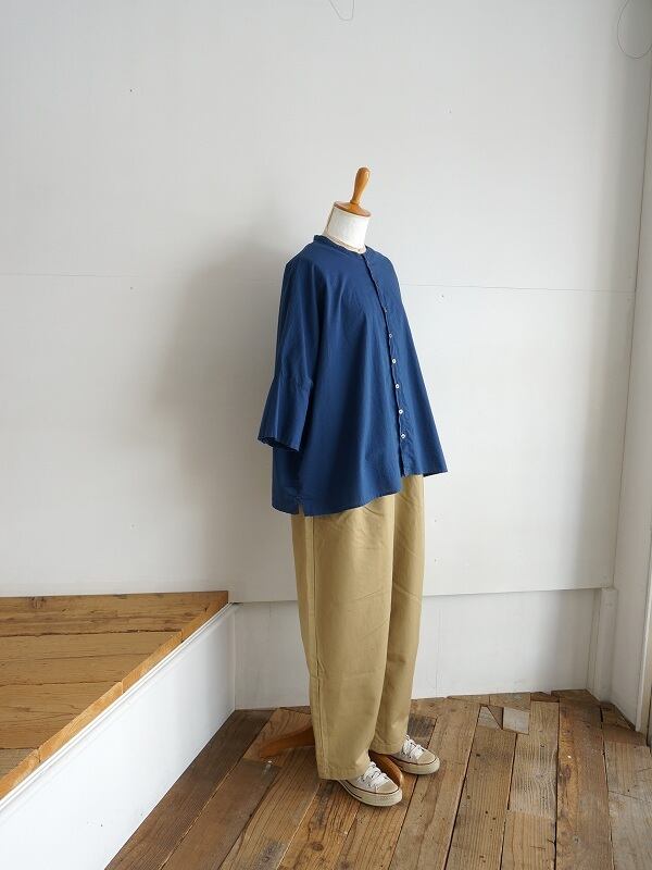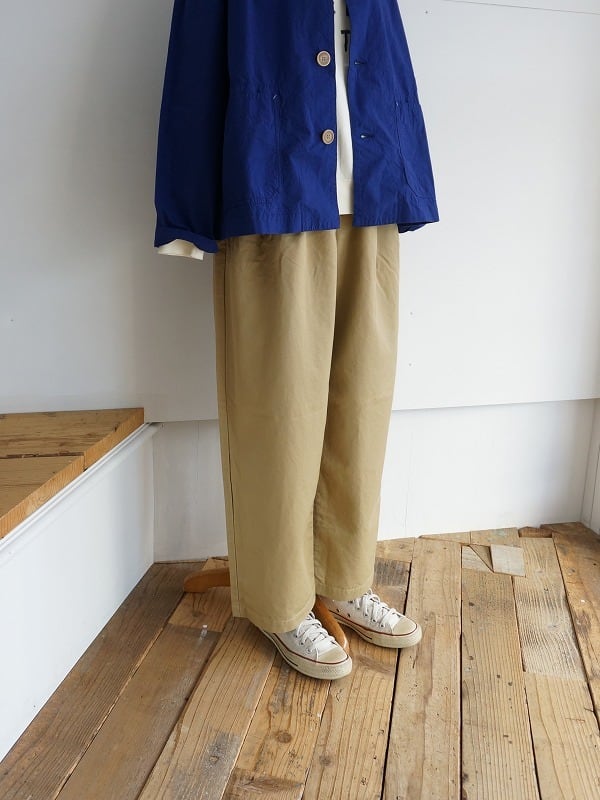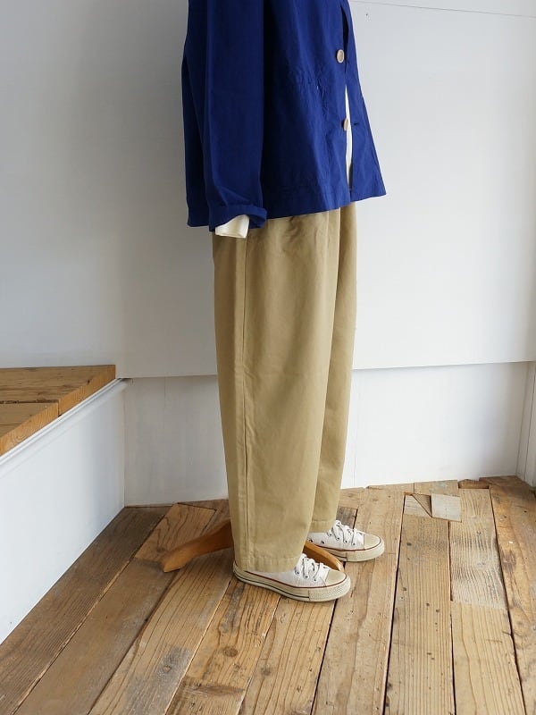 ワタリにかけてボリュームを持たせ、裾へややテーパードした形。トップスとのバランスもとりやすく、ロールアップしてもいい感じ。幅広く着回しに活用していただけます。
