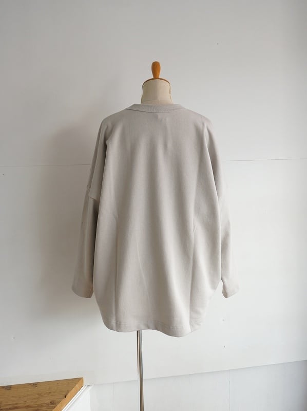 身幅はゆったりしていて、裾に向かってまるみのあるシルエットが特徴的。袖はすっきりしているので全体的に収まりよく仕上がっています。