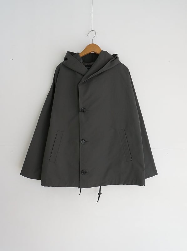深い前合わせからの立体的なフードの立ち上がりがポイント。すっきりとしたドロップショルダーで、裾へかけてゆるやかなAラインのシルエットになっています。裾にはひもが通っていますので絞ってシルエットに変化をつけてみてください。