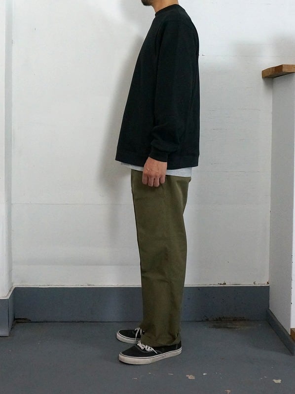適度にゆとりのあるリラックスフィットのシルエットで、袖口のたまり具合もいい感じ。裏毛なので長い期間着用でき、一枚で雰囲気のある着こなしが楽しめます。