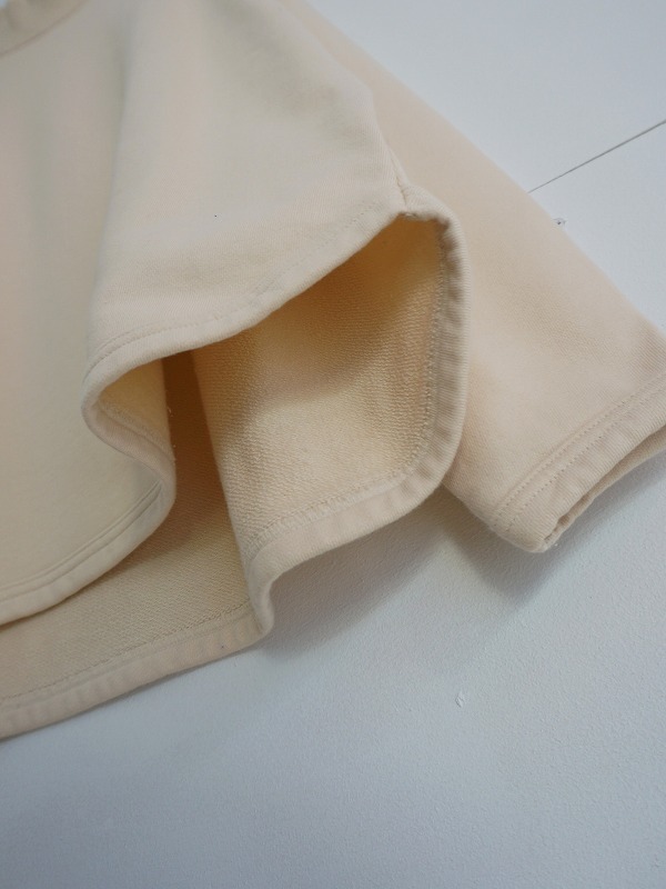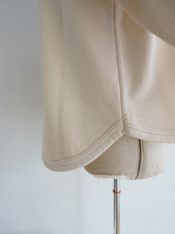 ラウンドした裾のラインと、袖口のタックがポイント。首の締めつけ感はなく、リラックスして着られる形になっています。肌触りよく、着心地よくて着回しにも便利な一枚です。