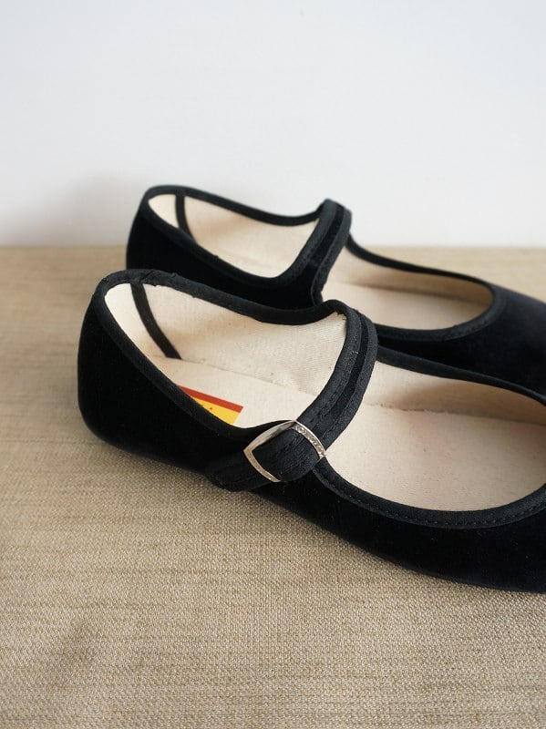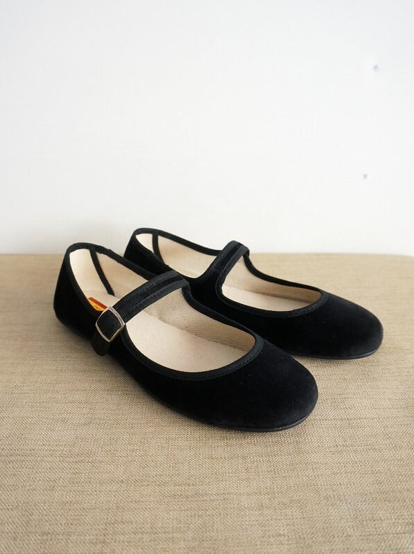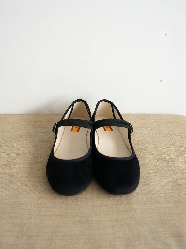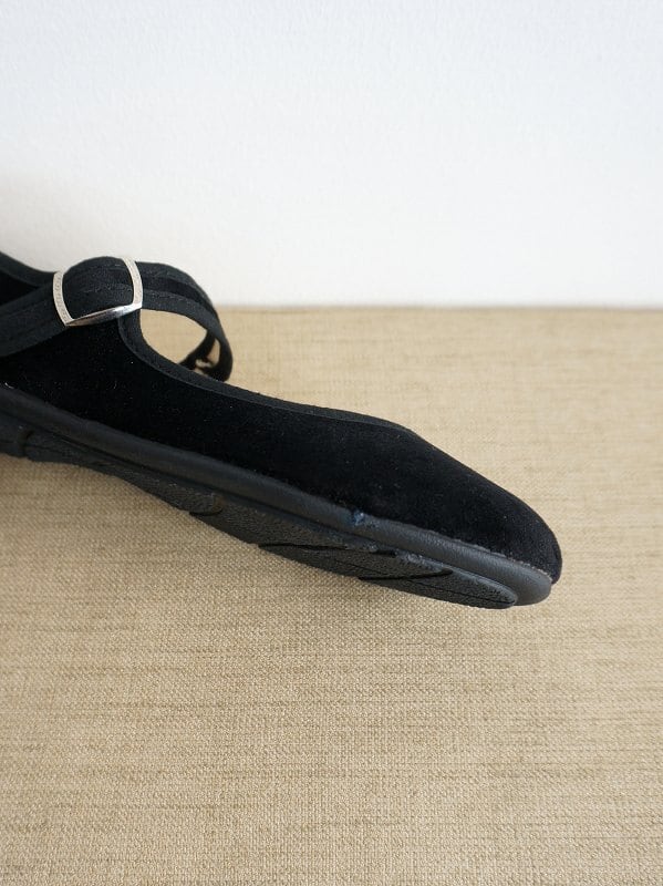 アッパーにベルベット調の生地を使用したストラップシューズです。