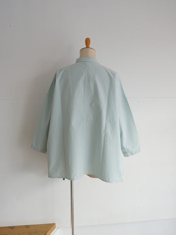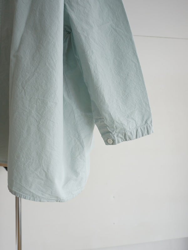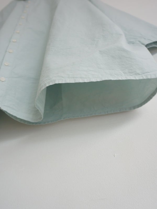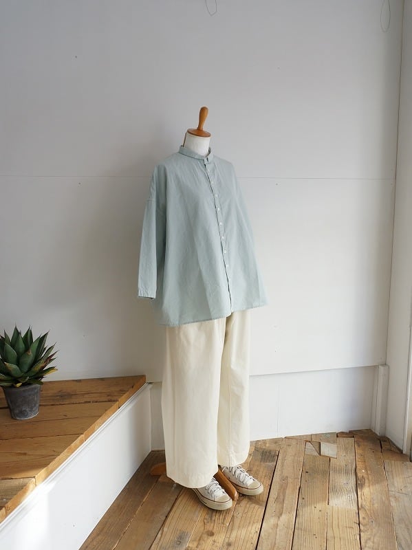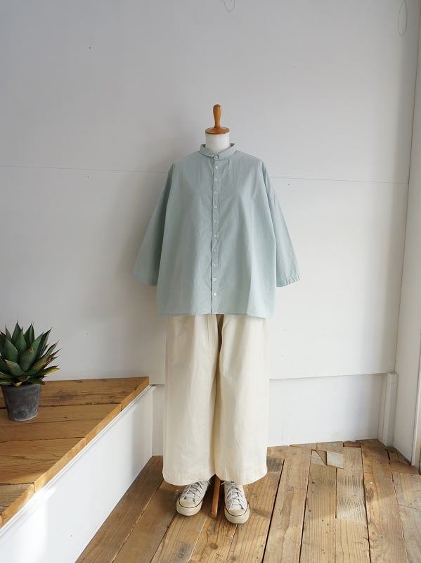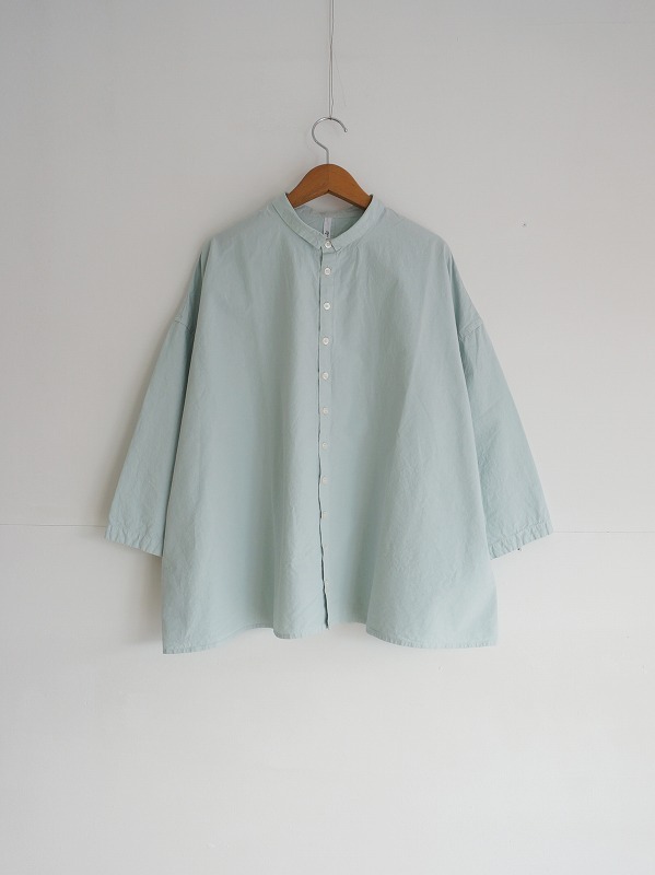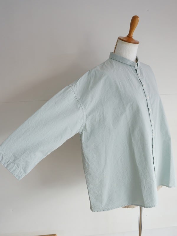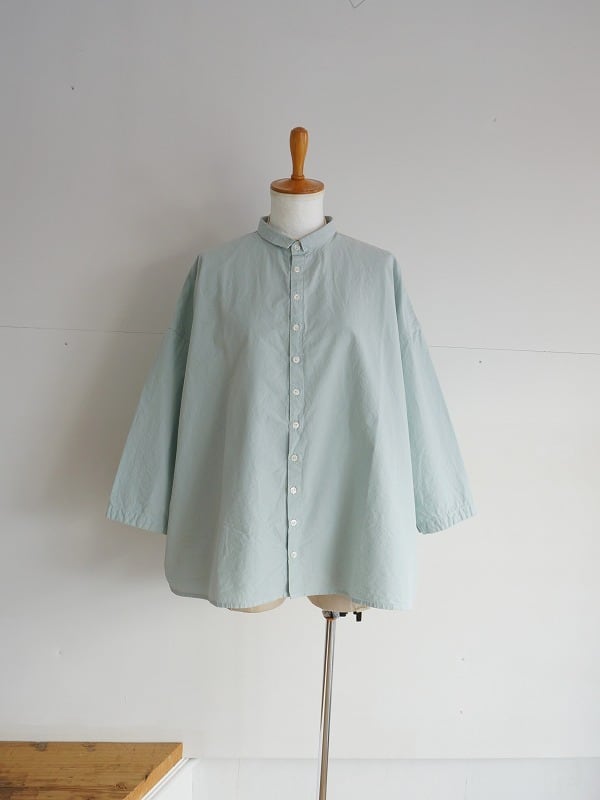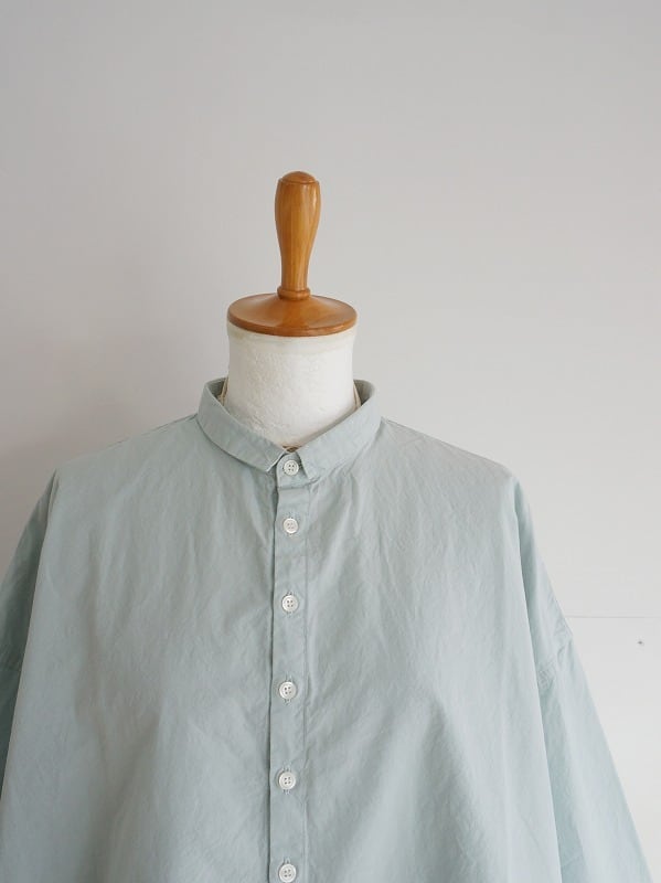 小さな襟とちょっと多めに並んだボタンがポイントのシャツ。高密度に織られたダンプの生地を使った、張り感が心地良い一枚です。