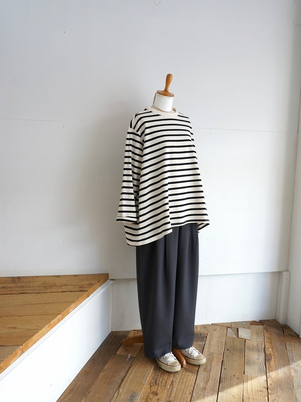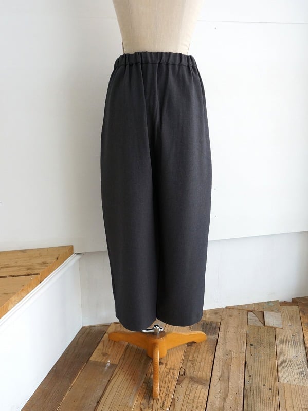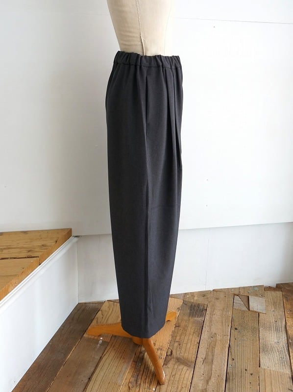 ウエストに浅めの2タックが入り、ワタリにかけて控えめにふくらみを持たせたゆるやかなコクーンシルエットになっています。トップスとのバランスがとりやすく、きれい見えしながらも穿き心地はとてもラクチンです。