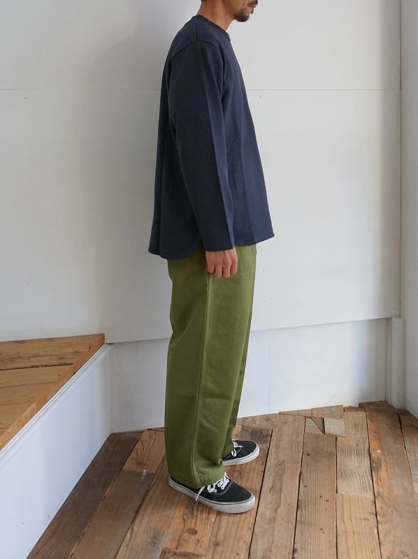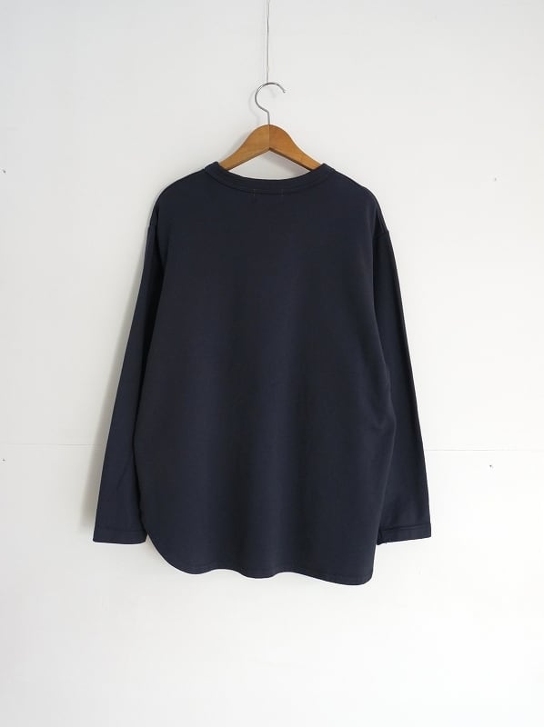 丈はちょっと長めの設定。裾をラウンドさせて軽さを出したデザインです。生地の厚みも裏毛では薄い部類に。しなやかで軽い素材感のすっきり着られる一枚です。ユニセックスで着用できるサイズ展開になっています。