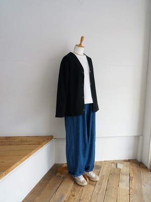甘撚りの糸で織り上げられたやわらかな風合いの10㌉デニムを使っています。ウエストがゴム仕様のリラックスして穿けるパンツです。サイドを接いで3面体で仕上げられ、ボリュームがありつつも縦長効果ですっきり見えするシルエットになっています。